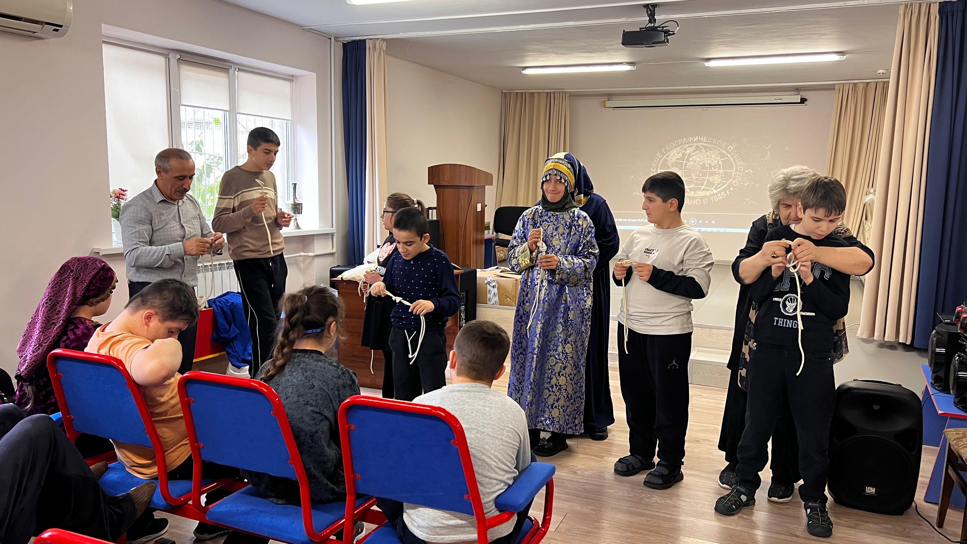В программе мероприятия «География – детям» приняли участие преподаватели Академии и специалисты Молодёжного центра ДРО РГО. Ребята узнали об истории старейшего общественного объединения России и современных проектах, реализуемых в Дагестане. Особый интерес вызвали практические занятия: мастер-класс по вязанию морских узлов от Тагира Балгуева и творческая мастерская «Знакомство с дагестанским костюмом» от Разитты Гаджихановой.