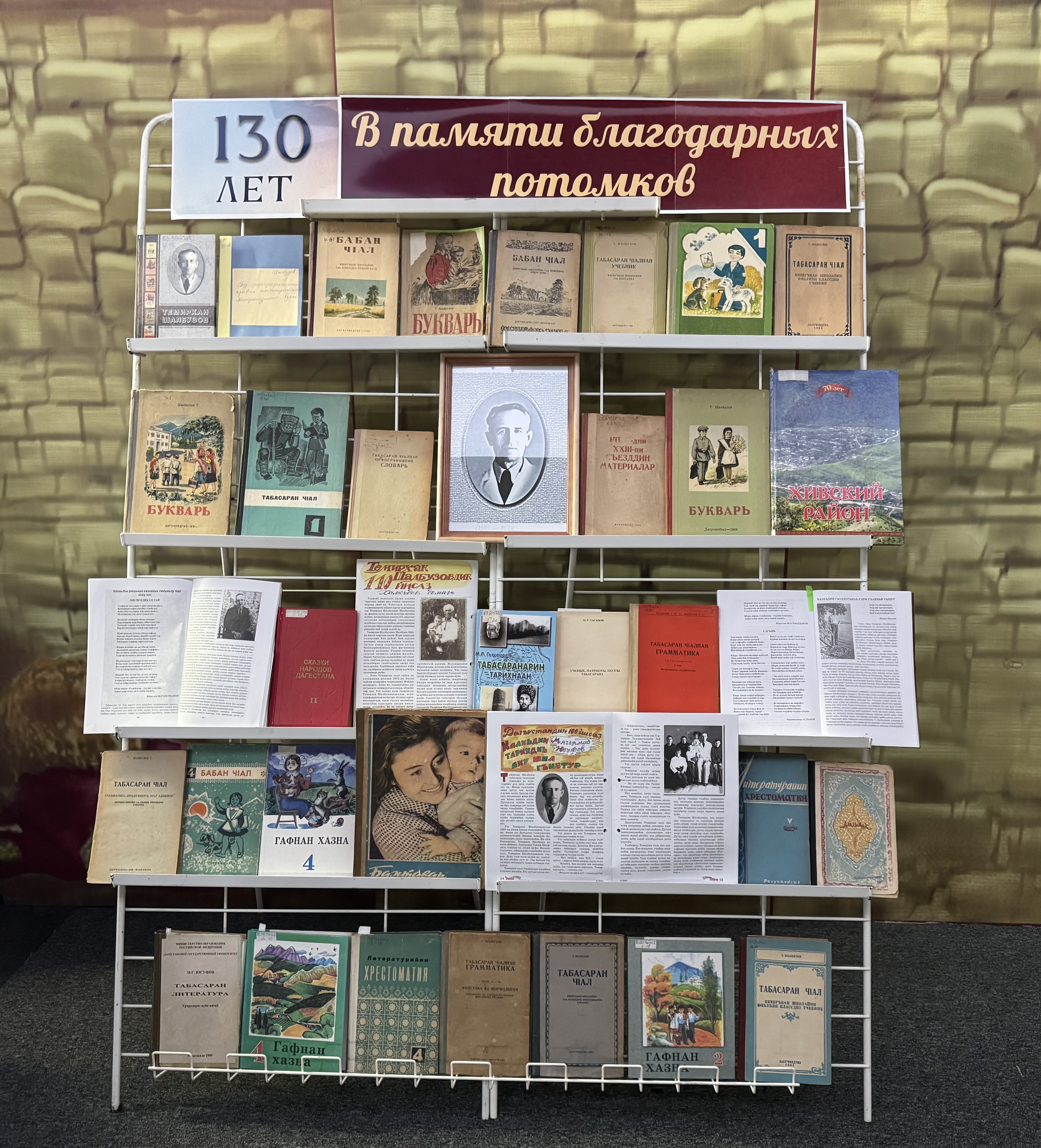 В читальном зале краеведческого отдела Национальной библиотеки вниманию посетителей представлена книжная выставка, приуроченная 130-летию со дня рождения известного просветителя и педагога, одного из создателей табасаранского букваря Темирхана Шалбузова. К плеяде табасаранских просветителей, поэтов, ученых давший колоссальный заряд духовности своему народу, принадлежит и Темирхан Шалбузович. Вся его жизнь была отдана своему народу. Это была светлая личность по своей внутренней сути, да и по внешнему облику: высокий и прямой, даже в старости, с белоснежной сединой, открытым лицом, ясным взглядом, который выражал свет его ума и чистоту души. Шалбузов (1895 – 1978) – уроженец с. Хив Кюринского округа в крестьянской семье. Он был единственным сыном и его отец Шалбуз, не считаясь с трудностями и затратами, решил дать сыну образование. Табасараны, как и представители остальных дагестанских народов, учились у известных в то время арабистов в аулах Дагестана. Однако центром арабистов и вообще богословской школы в Юждаге считались Ахты. Обладая от природы живым умом и острой наблюдательностью, он вызывал симпатии своих учителей, которые способствовали его увлечению не только арабским, но и другими восточными языками: персидским, турецким, азербайджанским, из дагестанских – лезгинским, кумыкским и др. Изучал он и русский язык. Читал книги из богатой библиотеки Гаджи Абдурахмана Эфенди из сел. Ахты, а также своего учителя Зияутдина Гаджи-Юсуфа Курихи. Имея уже опыт и в богословских и светских науках Шалбузов в 1916 г. остановился в сел. Куркент Кюринского округа. Отсюда он начал свою педагогическую деятельность: здесь открыл богословскую школу, как арабист, обучая детей духовным дисциплинам, все более расширял преподавание и светских дисциплин.